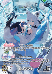 効果: 自分の白ホロメンが相手のホロメンをダウンさせた時、自分のステージのマスコット2枚につき、サイコロを1回振れる:奇数が1回以上出たなら、相手のライフ-1。