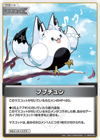 このマスコットが付いているホロメンのHP+20。 ◆〈白上フブキ〉に付いていたら能力追加 このマスコットが付いているホロメンがコラボした時、自分のアーカイブのマスコット1枚を手札に戻せる。 マスコットは、自分のホロメン1人につき1枚だけ付けられる。