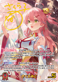 | 推しスキル | 35P帰ってくるのかッ!?って! 効果: サイコロを1回振れる:1か2か4か6の時、自分のアーカイブの〈35P〉1枚を手札に戻す。3か5の時、自分のアーカイブの〈35P〉2枚を手札に戻す。 コスト: 2 |