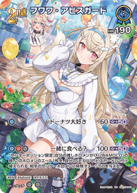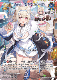 | アーツ2 | 一緒に食べる?(パワー: 100 (紫+50)) 効果: [センターポジション限定]自分の推しホロメンが〈FUWAMOCO〉の時、このホロメンのエール1枚を、自分の〈モココ・アビスガード〉に付け替えられる:相手のセンターホロメンに特殊ダメージ50を与える。 コスト: 青,赤,無 |