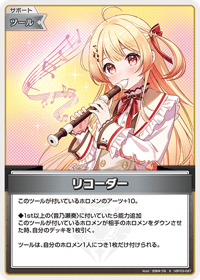このツールが付いているホロメンのアーツ+10。 ◆1st以上の〈音乃瀬奏〉に付いていたら能力追加 このツールが付いているホロメンが相手のホロメンをダウンさせた時、自分のデッキを1枚引く。 ツールは、自分のホロメン1人につき1枚だけ付けられる。