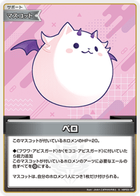 このマスコットが付いているホロメンのHP+20。 ◆〈フワワ・アビスガード〉か〈モココ・アビスガード〉に付いていたら能力追加 このマスコットが付いているホロメンのアーツに必要なエールの色すべてを無色エールにする。 マスコットは、自分のホロメン1人につき1枚だけ付けられる。