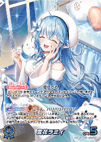 効果: 自分の〈雪花ラミィ〉1人を選ぶ。このターンの間、選んだホロメンが、相手のホロメン1人に与える特殊ダメージ+100し、選んだホロメンが相手のホロメンをダウンさせた時、自分のデッキを2枚引く。