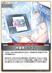 このカードは、自分の手札がこのカードを含まずに6枚以下でなければ使えない。 自分のデッキの上から4枚を見る。その中から、ホロメン1枚と[ツールかマスコットかファン]1枚を公開し、公開したカードを手札に加える。そして残ったカードを好きな順でデッキの下に戻す。 LIMITED:ターンに1枚しか使えない。