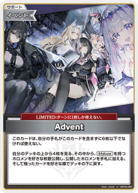 このカードは、自分の手札がこのカードを含まずに6枚以下でなければ使えない。 自分のデッキの上から4枚を見る。その中から、#Adventを持つホロメンを好きな枚数公開し、公開したホロメンを手札に加える。そして残ったカードを好きな順でデッキの下に戻す。 LIMITED:ターンに1枚しか使えない。