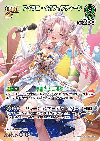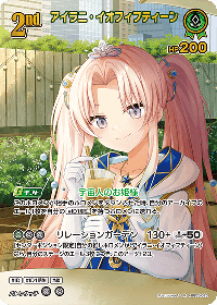 | アーツ1 | リレーションガーデン(パワー: 130 (白+50)) 効果: [センターポジション限定]自分の推しホロメンが〈アイラニ・イオフィフティーン〉なら、自分のステージのエール3枚につき、このアーツ+20。 コスト: 緑,無,無 |
