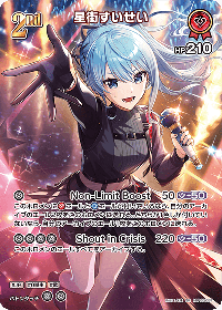 | アーツ1 | Non-Limit Boost(パワー: 50 (紫+50)) 効果: このホロメンに赤エールと青エールが付いているなら、自分のアーカイブのエール2枚をこのホロメンに送れる。どちらか1色しか付いていないなら、自分のアーカイブのエール1枚をこのホロメンに送れる。 コスト: 無 |