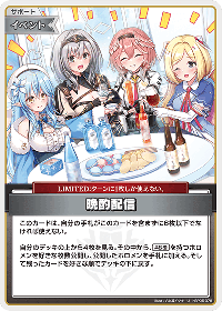 このカードは、自分の手札がこのカードを含まずに6枚以下でなければ使えない。 自分のデッキの上から4枚を見る。その中から、#お酒を持つホロメンを好きな枚数公開し、公開したホロメンを手札に加える。そして残ったカードを好きな順でデッキの下に戻す。 LIMITED:ターンに1枚しか使えない。