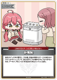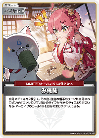 自分のデッキを2枚引く。その後、直前の相手のターンに自分のホロメンがダウンしていて、自分のライフが相手のライフより少ないなら、アーカイブのエール1枚を自分のホロメン1人に送る。 LIMITED:ターンに1枚しか使えない。