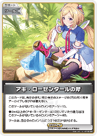 このカードは、自分の手札1枚か自分のステージの〈石の斧〉1枚をアーカイブしなければ使えない。 このツールが付いているホロメンのアーツ+10。 ◆2nd以上の〈アキ・ローゼンタール〉に付いていたら能力追加 このツールが付いているホロメンのアーツ+40。 ツールは、自分のホロメン1人につき1枚だけ付けられる。