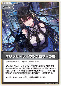このツールが付いているホロメンのアーツ+10。 ◆2nd以上の〈ネリッサ・レイヴンクロフト〉に付いていたら能力追加 [センターポジション・コラボポジション限定][ターンに1回]このツールが付いているホロメンの能力で自分の手札をアーカイブした時、相手のセンターホロメンかコラボホロメンに特殊ダメージ20を与える。 ツールは、自分のホロメン1人につき1枚だけ付けられる。