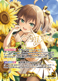 | 推しスキル | おまつりわっしょーい!!! 効果: サイコロを1回振る。出た目の数が自分のライフ以上なら、自分のデッキから、カード1枚を手札に加える。そしてデッキをシャッフルする。出た目の数が自分のライフ以下なら、自分のデッキの上から1枚をホロパワーにする。 コスト: 2 |