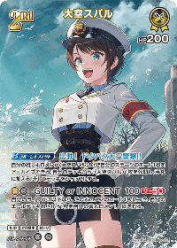 | アーツ1 | GUILTY or INNOCENT(パワー: 100 (赤+50)) 効果: 自分のライフが3以下なら、このホロメンのエール1枚につき、自分のエールデッキの上から1枚を自分の黄ホロメン1人に送れる。 コスト: 黄,無 |