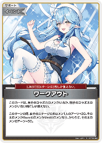 このカードは、自分のコラボホロメンがいるか、相手のコラボホロメンがいない時にしか使えない。 このターンの間、自分のステージのホロメン1人のアーツ+20。そのホロメンがBuzzホロメンか2ndホロメンなら、かわりに、そのホロメンのアーツ+50。 LIMITED:ターンに1枚しか使えない。