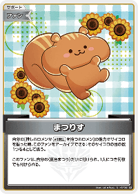 自分の[推しホロメンか#1期生を持つホロメン]の能力でサイコロを振った時、このファンをアーカイブできる:そのサイコロの目の数1つを4として扱う。 このファンは、自分の〈夏色まつり〉だけに付けられ、1人につき何枚でも付けられる。
