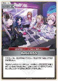 このカードは、自分の手札がこのカードを含まずに6枚以下でなければ使えない。 自分のデッキの上から4枚を見る。その中から、#ReGLOSSを持つホロメンを好きな枚数公開し、公開したホロメンを手札に加える。そして残ったカードを好きな順でデッキの下に戻す。 LIMITED:ターンに1枚しか使えない。